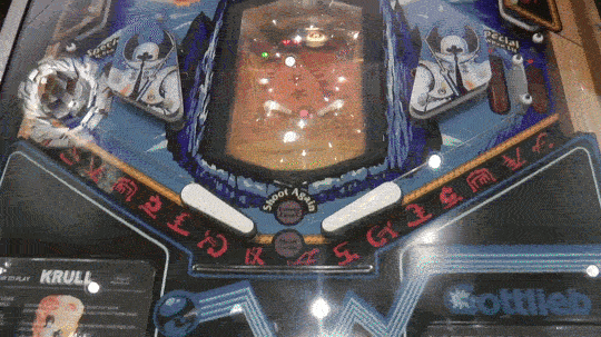 O pinball de Krull é uma preciosidade: uma máquina lindíssima, cheia de detalhes inspirados no filme. No painel interno, em segundo plano, você encontra a batalha final dentro da Fortaleza da Besta. Era uma forma de transportar a mitologia do cinema para dentro de uma mesa de jogo.